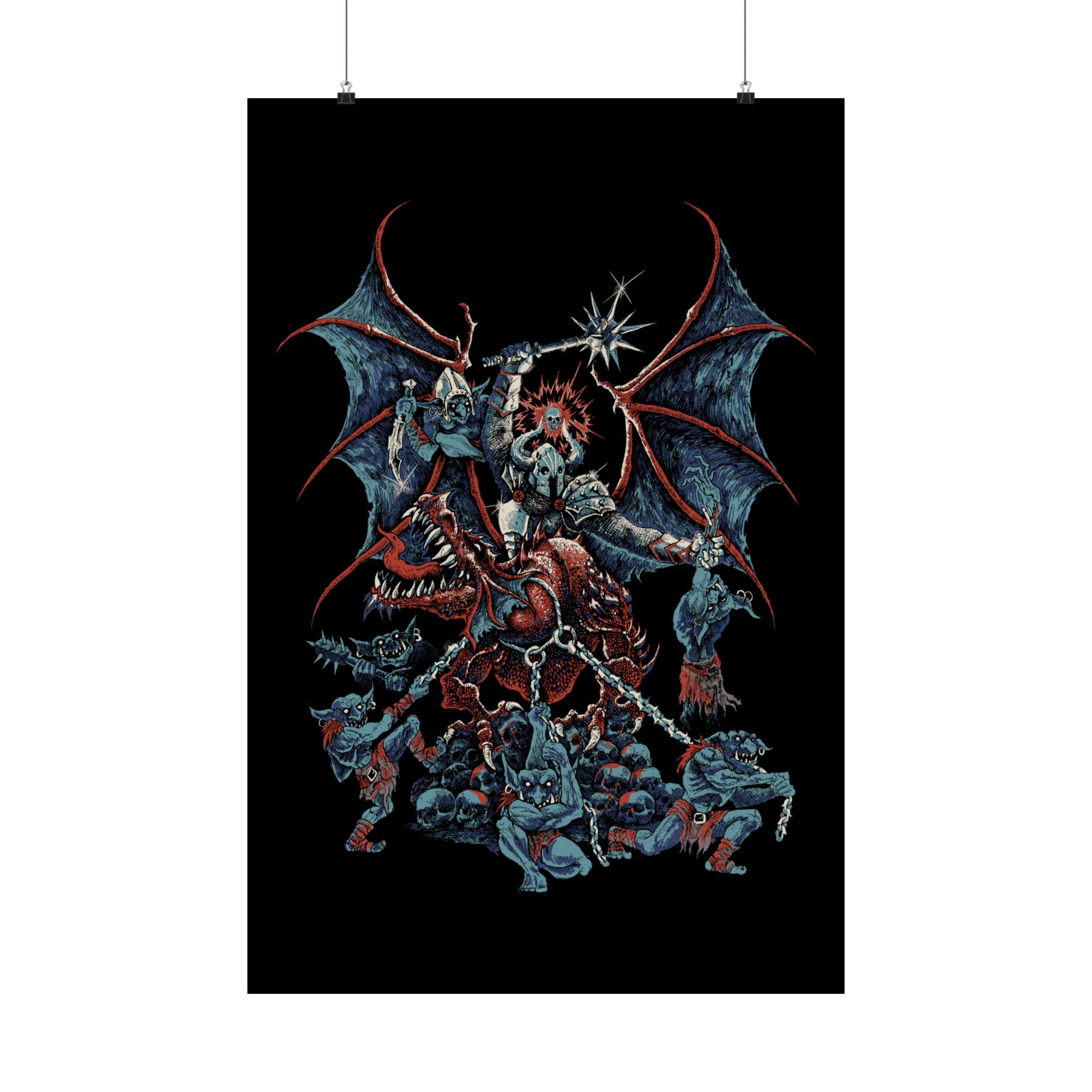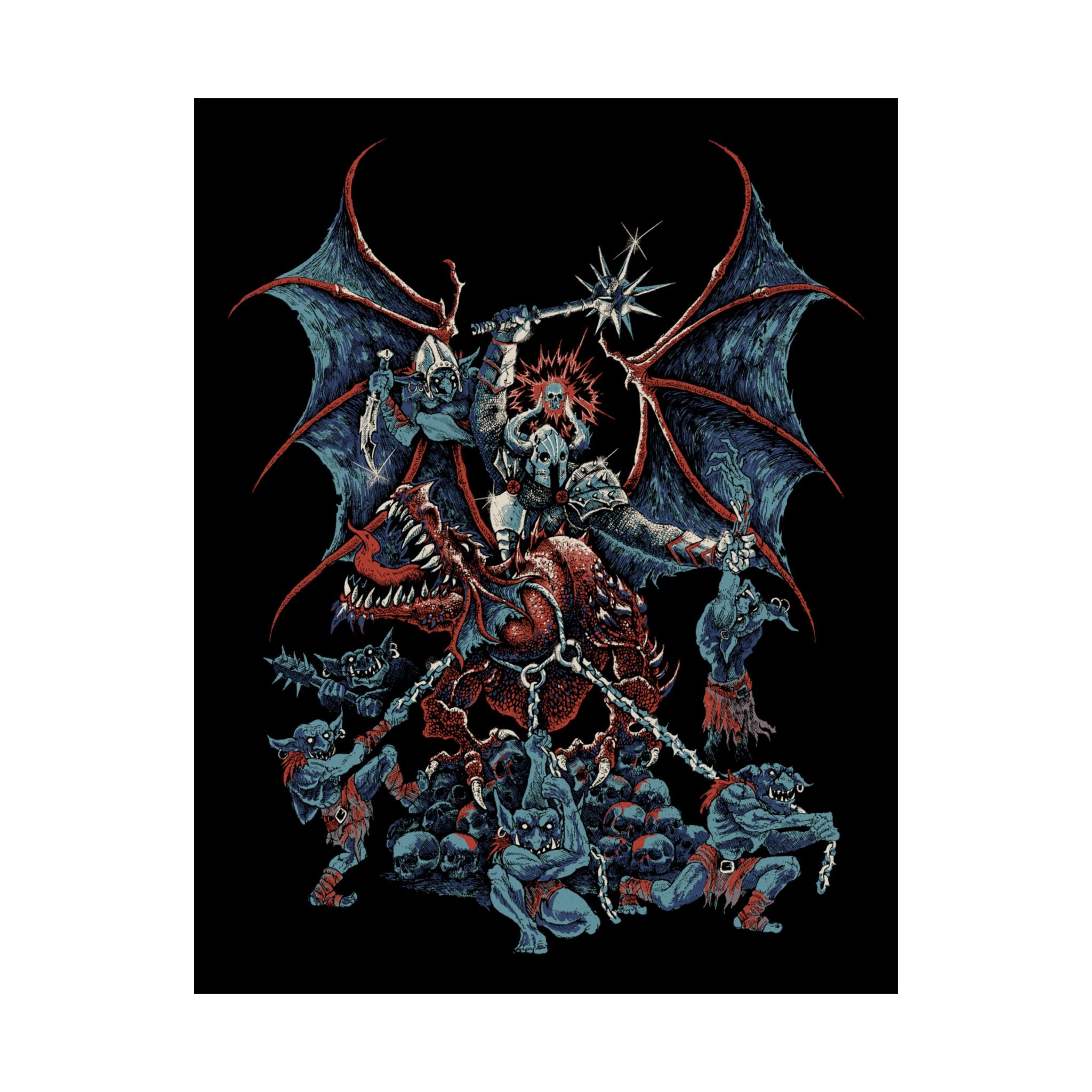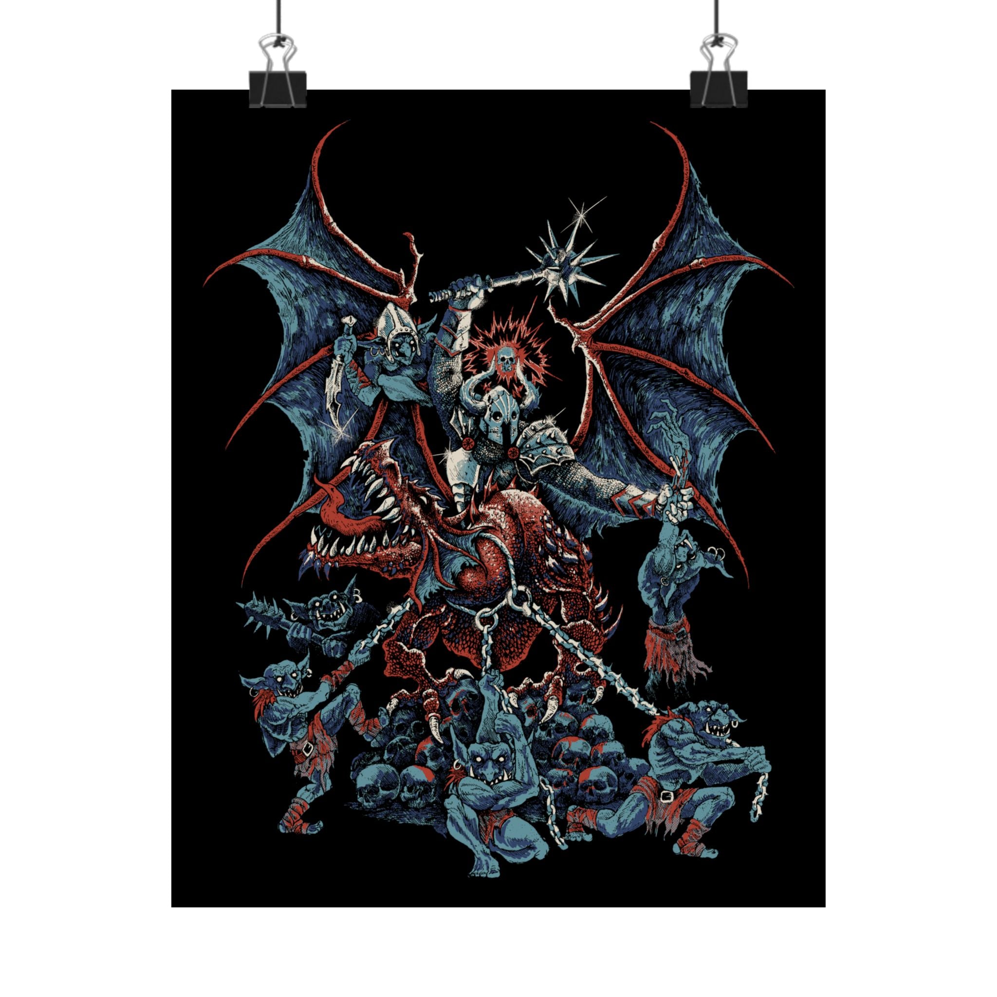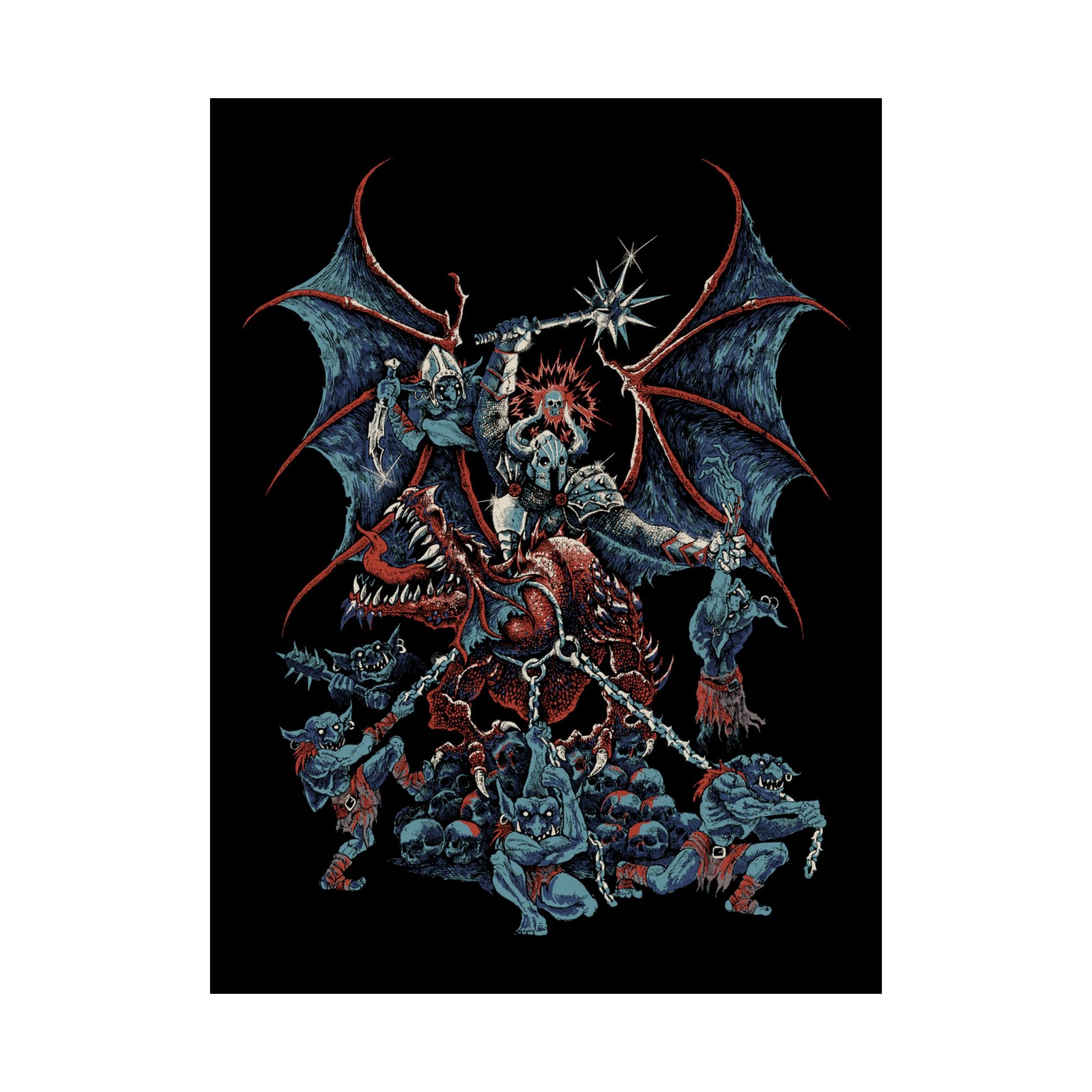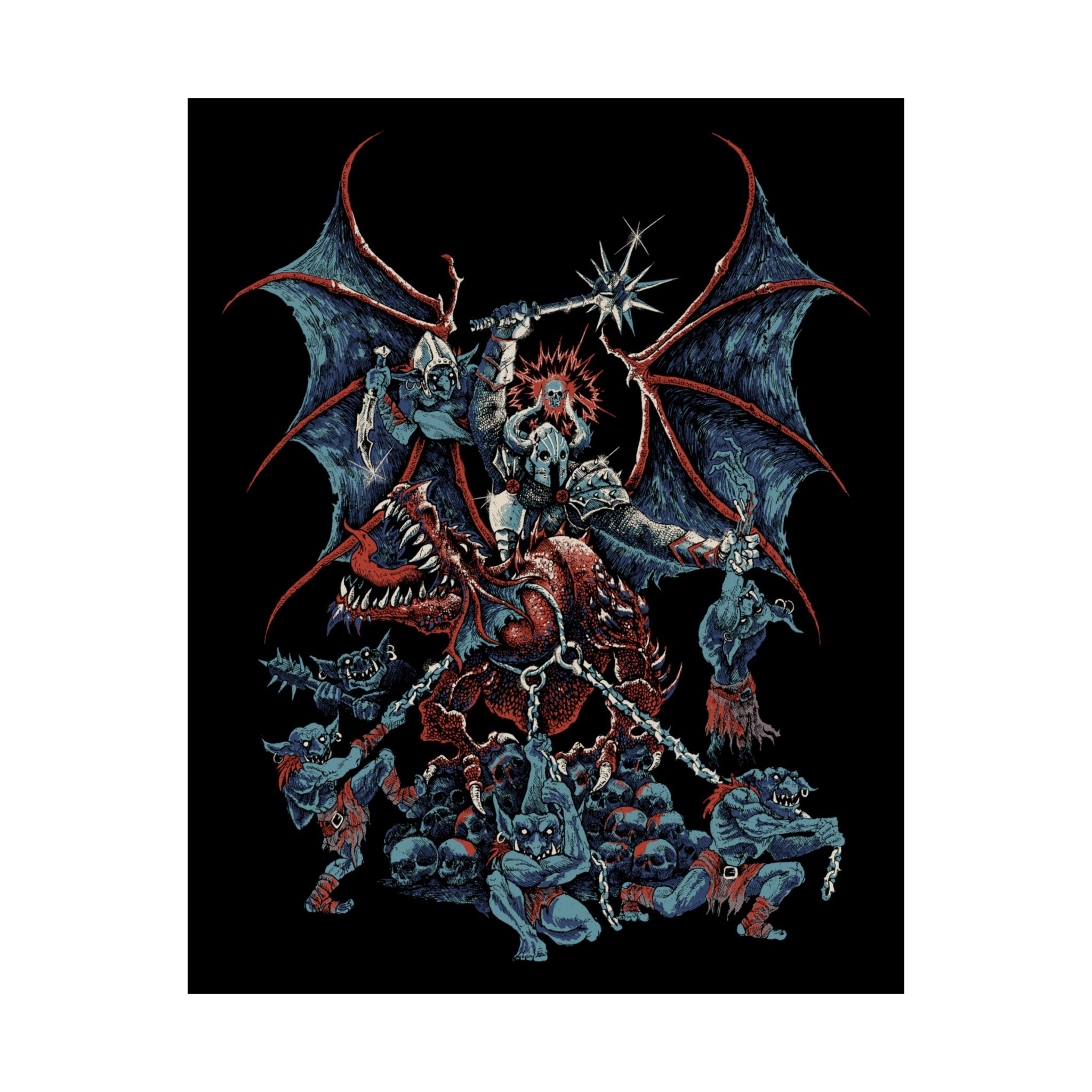 In the pitch dark an iron Dragon riding DnD character wrestles with the untamed goblin hordes. This chaotic fantasy scene unfolds in some far-off D&D den, drawing inspiration from Heavy Metal and Frank Frazetta. The satanic panic called and they want this poster as evidence. Blast some Castle Rat or Magic Sword. Original artwork prints by Narsil.