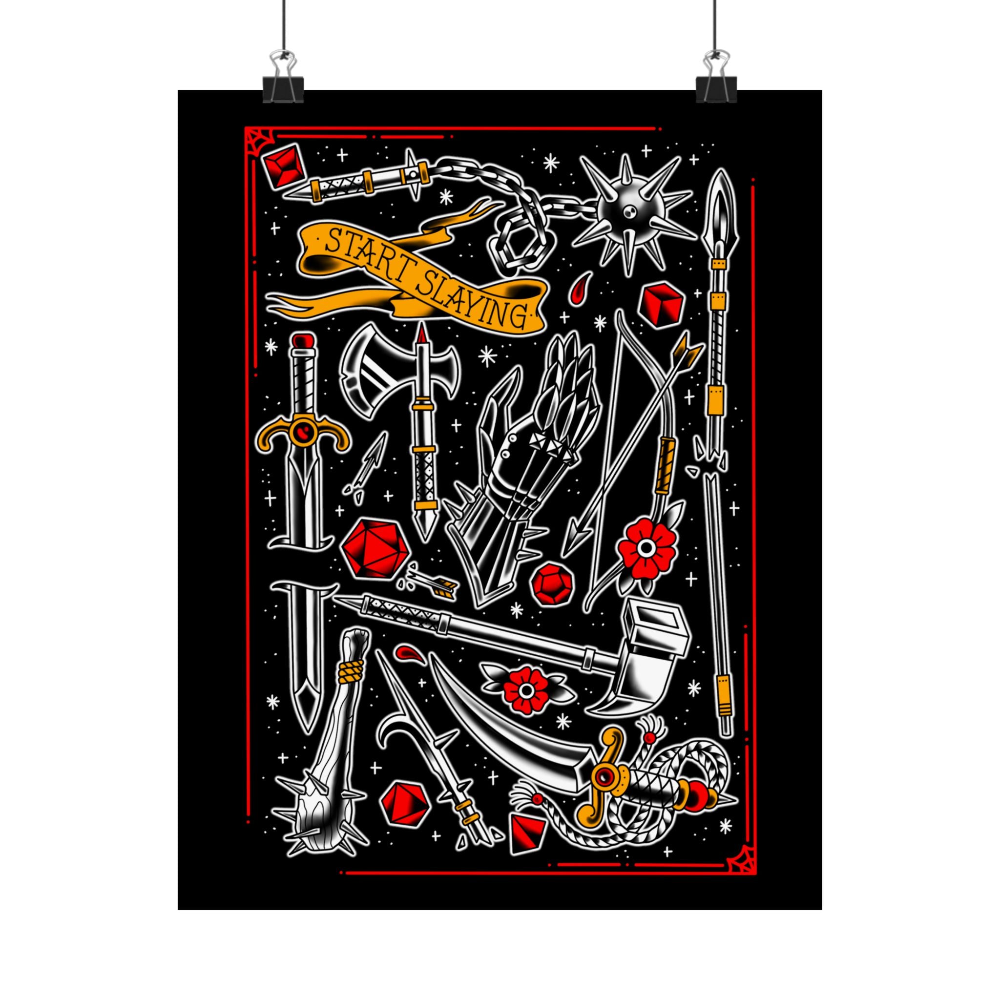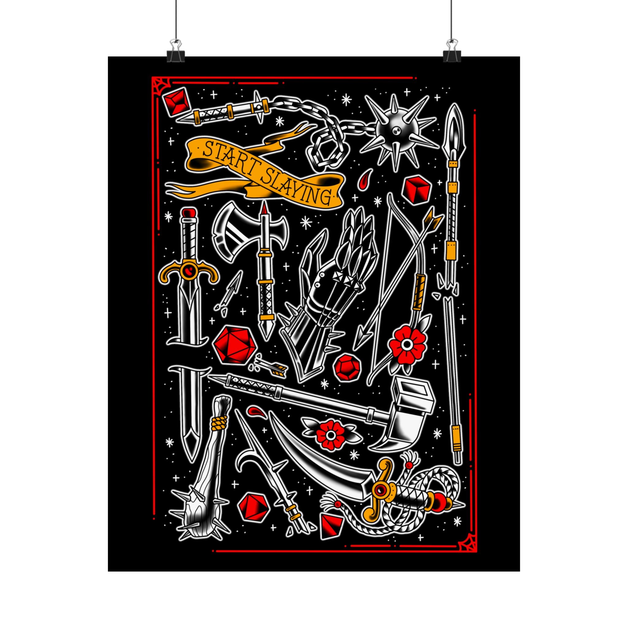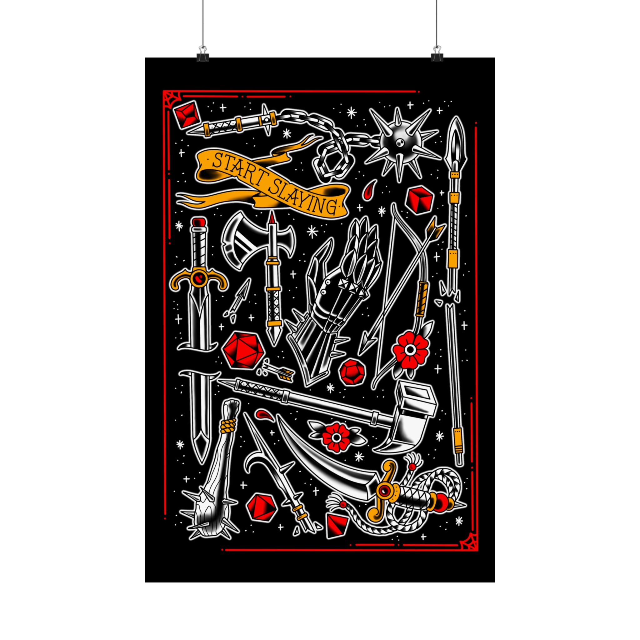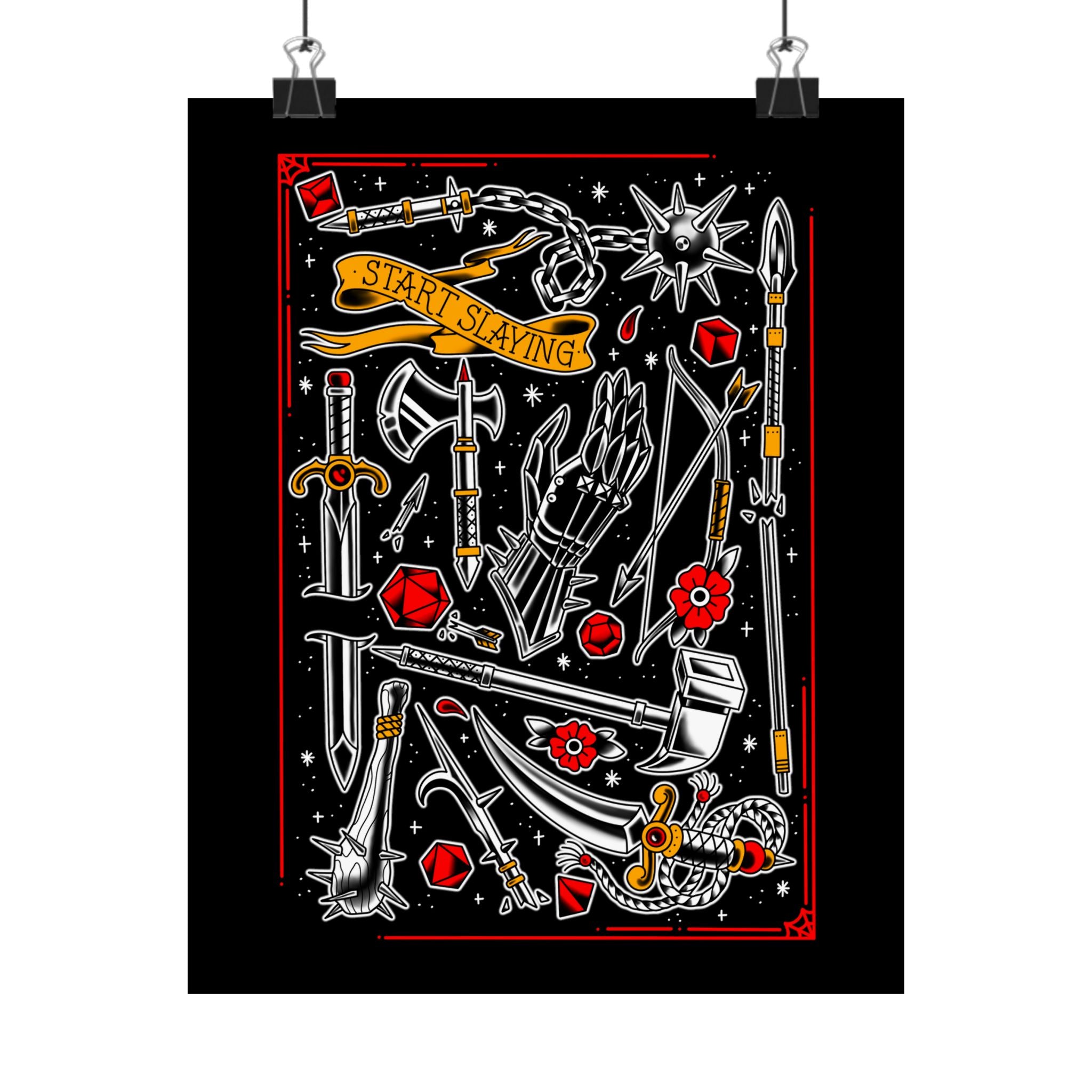 Inspired by storied tattoo D&D art, this print is for the tabletop DnD fighter. Step into the parlor and imagine your next tattoo or pick up a one-of-a-kind drawn weapon for that next Dungeons and Dragons fantasy campaign. Swords, axes, halberds, daggers, warpicks, spears, bows, and maces. Throw down the gauntlet and get yours today. Original artwork prints by Sam Rusk.