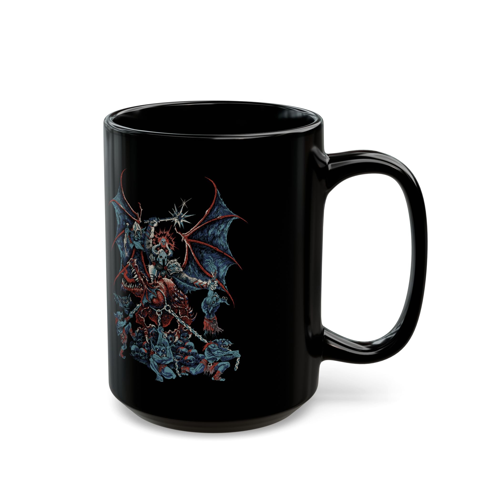 In the pitch dark an iron clad Dragon riding character wrestles with the untamed goblin hordes. This chaotic fantasy scene unfolds in some far-off D&D den, drawing inspiration from Heavy Metal and Frank Frazetta. The satanic panic called and they want this DnD mug as evidence. Blast some Castle Rat or Magic Sword and fill your cup to the brim. Original artwork prints by Narsil.
